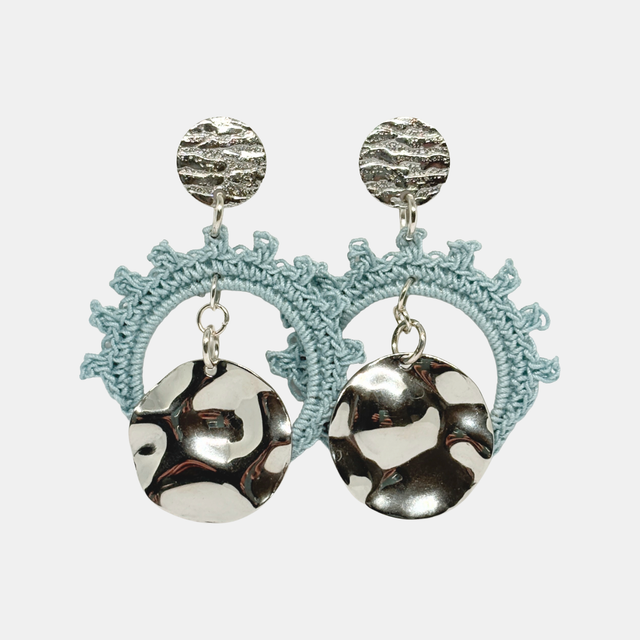 These statement earrings combine hand-crocheted circular forms made with fine cotton thread and silver-plated hammered discs. Finished with a protective varnish.