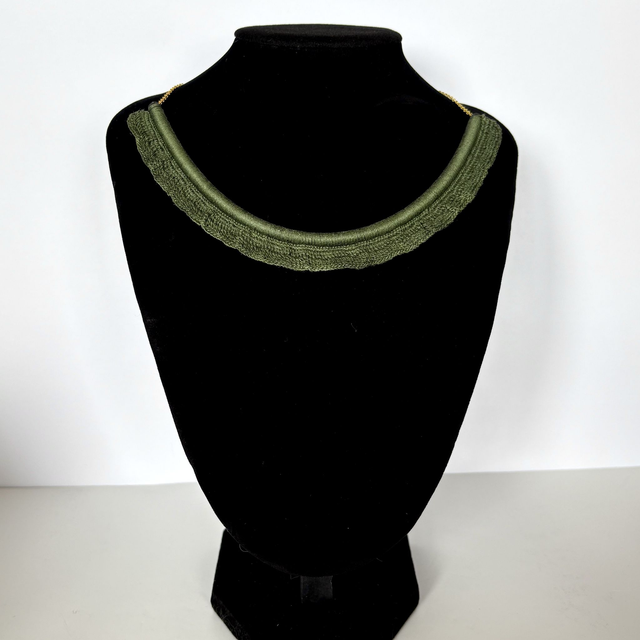Olive green handmade necklace featuring a 3D-printed base, hand-crocheted surface, and gold-plated chain. A sculptural yet lightweight statement piece designed for everyday wear.