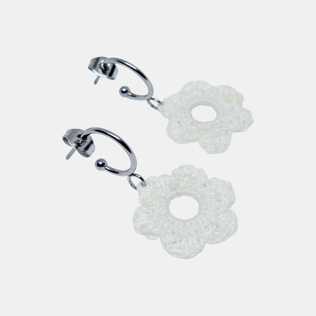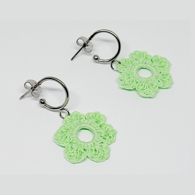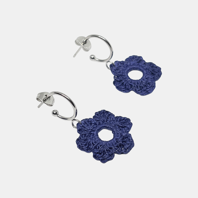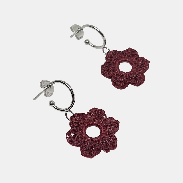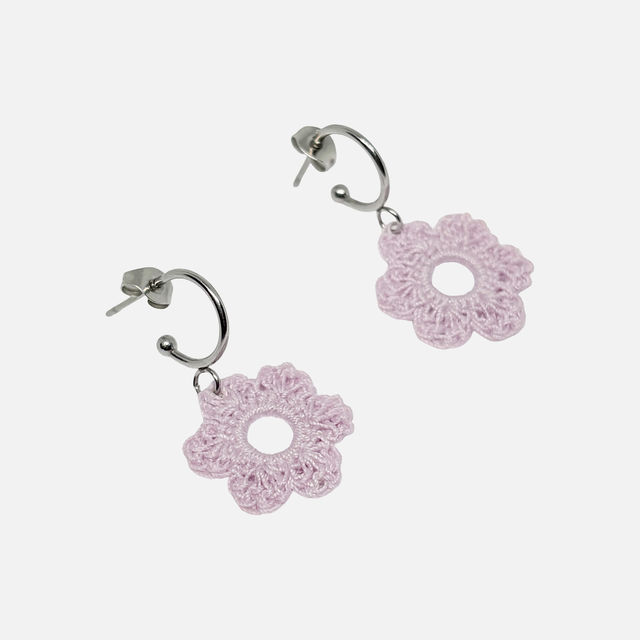 These small earrings feature hand-crocheted floral shapes made with fine cotton thread, mounted on silver-plated hoops. Finished with a protective varnish, they are lightweight, durable, and easy to wear.