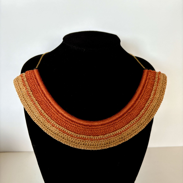 The Sunset Necklace features layered hand-crocheted tones of burnt orange and beige over a sculptural 3D-printed base. Finished with a gold-plated chain, it balances warmth, texture, and strong form in a lightweight statement piece.