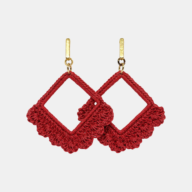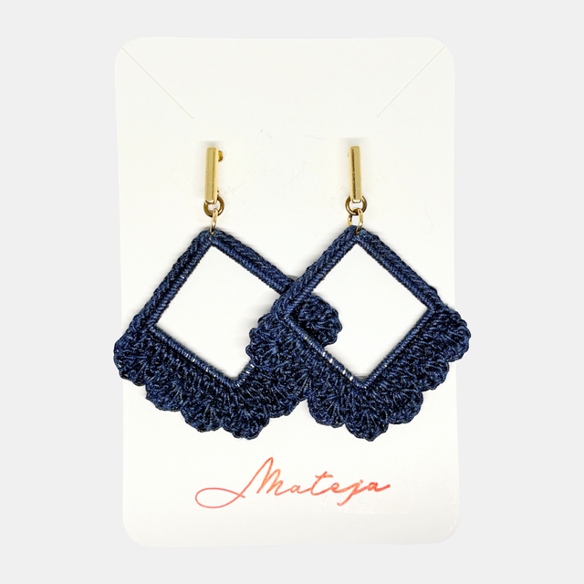 Hand-crocheted using fine cotton thread and mounted onto gold-plated findings, these earrings combine soft textile texture with a structured diamond shape. Sealed with a protective varnish, they are lightweight and designed for everyday wear.