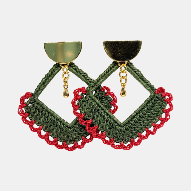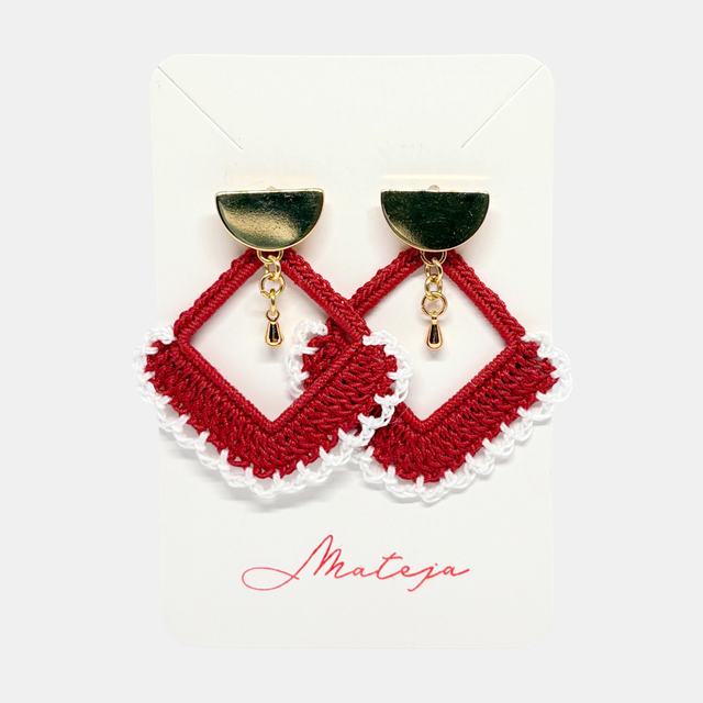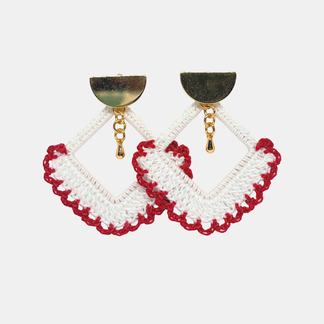 Hand-crocheted diamond shapes made with fine cotton thread are combined with gold-plated studs and small drop details. Finished with a protective varnish, these earrings are lightweight and hold their shape.