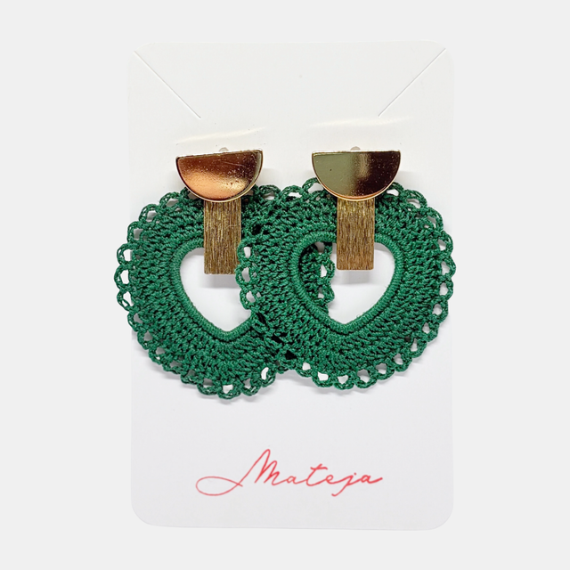 Hand-crocheted using fine cotton thread, these earrings feature heart-shaped openwork forms framed by delicate lace edging. Finished with brushed gold-plated geometric elements and a protective varnish, they are lightweight, tactile, and comfortable to wear.