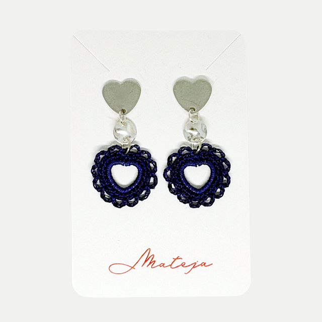Hand-crocheted heart motifs made with fine cotton thread are paired with gold-plated / silver plated heart studs. Finished with a protective varnish, these earrings are lightweight and comfortable.
