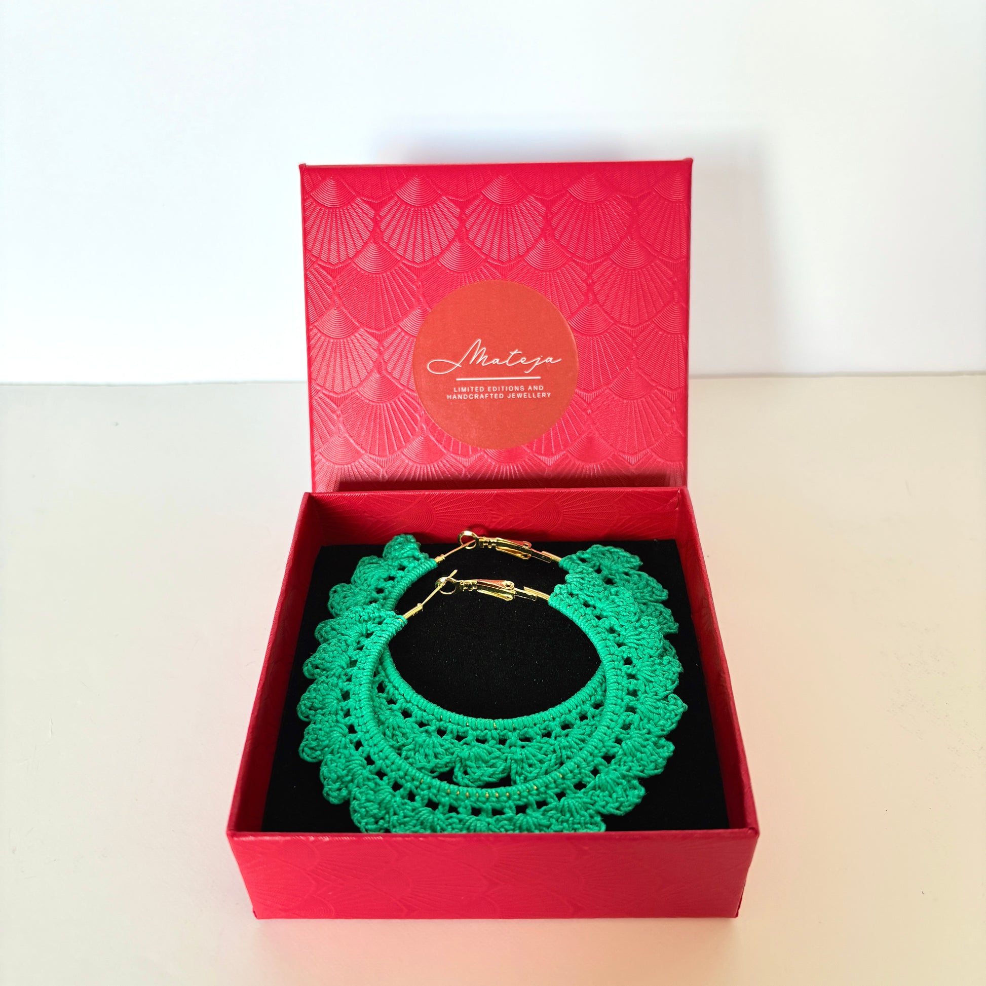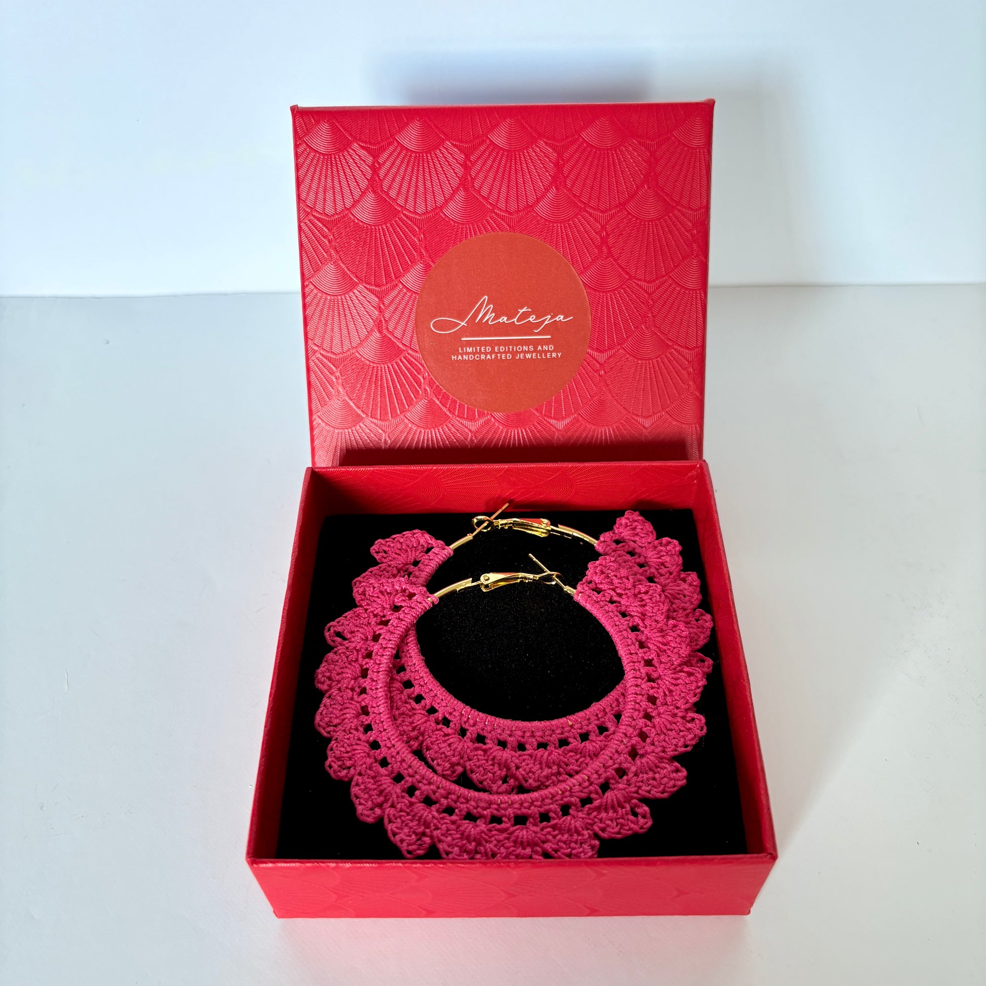Crafted with a fine microfibre thread and a 0.6mm hook. Paired with gold plated hoops 5cm in diameter. Varnished to keep them firm and long lasting.