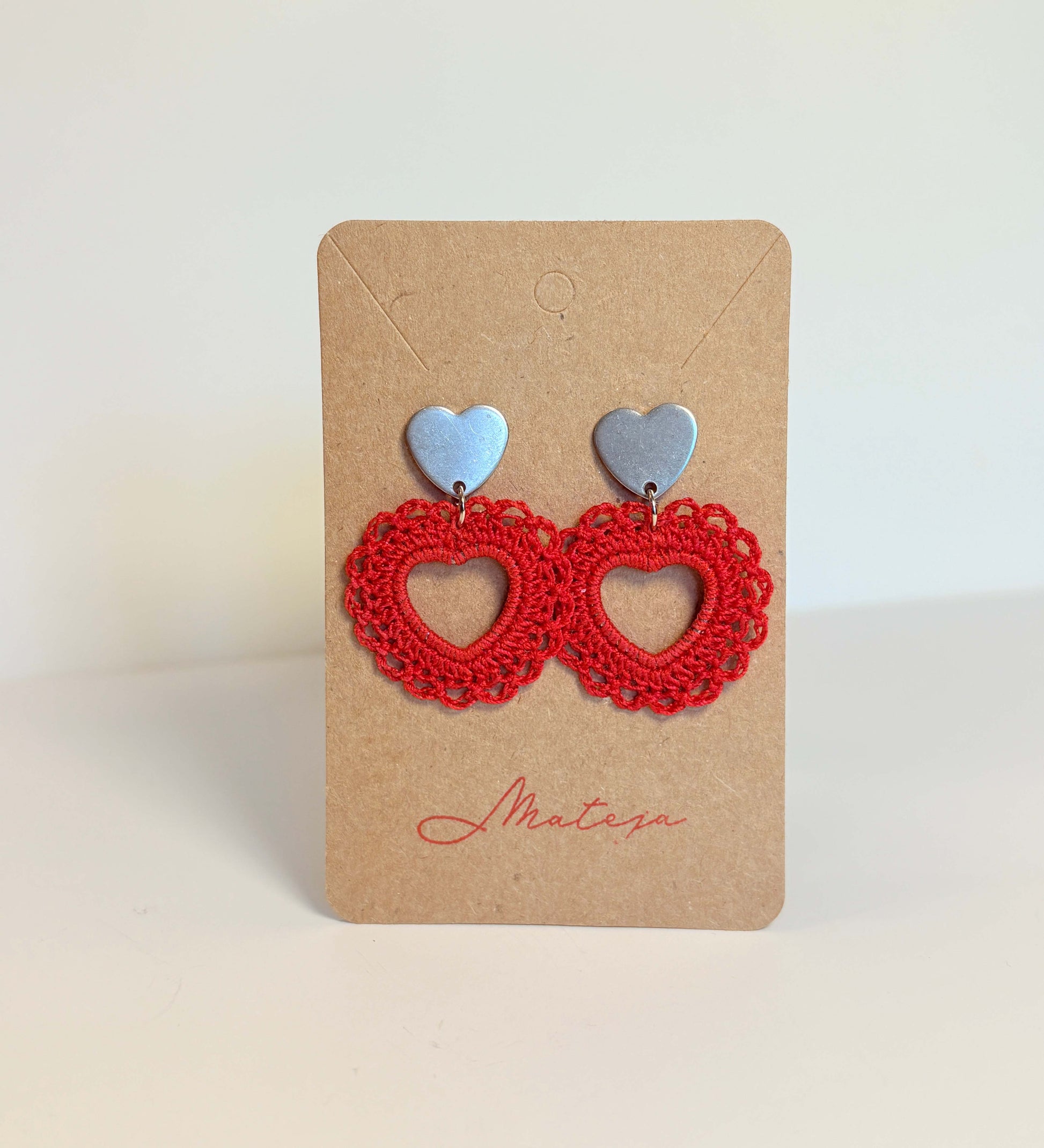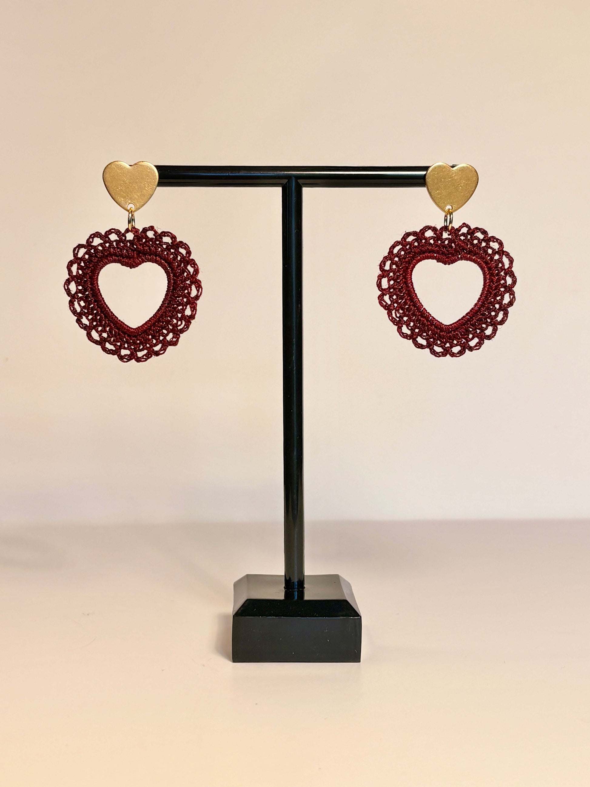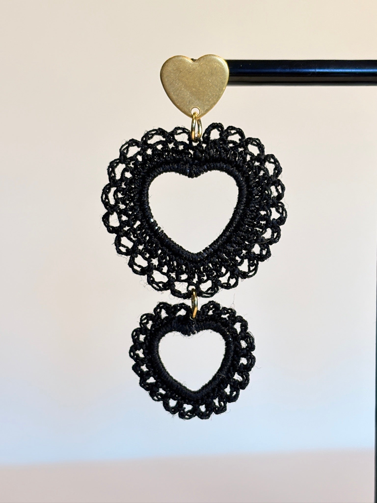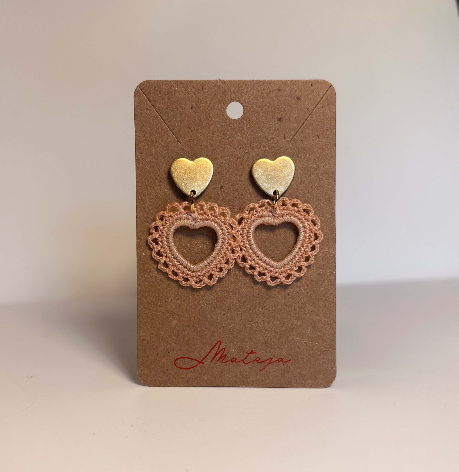 Fine crochet combined with brass elements and Gold Plated / Sterling Silver heart studs.