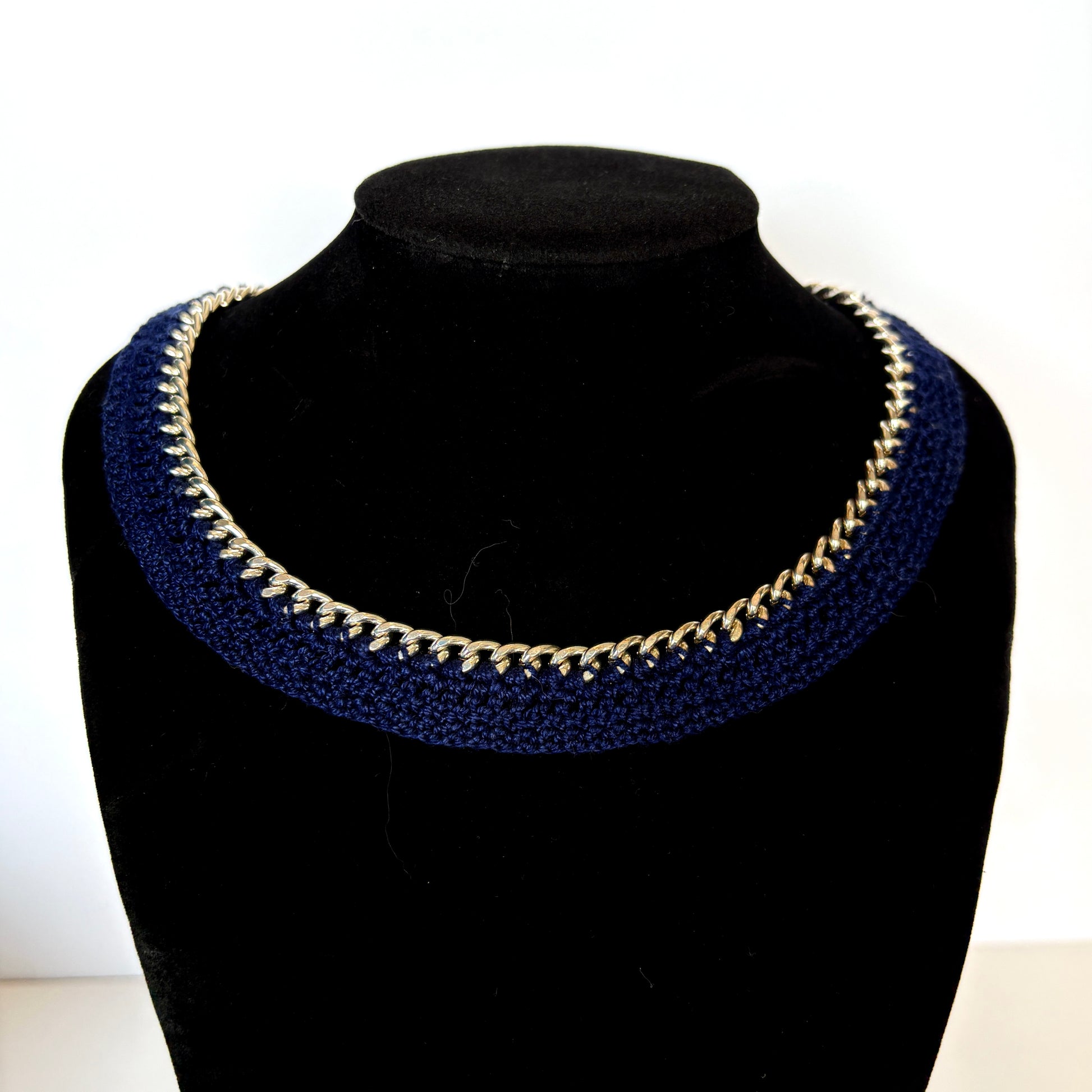 Crafted for those who embrace statement style with subtle edge, the Indigo Necklace fuses rich navy crochet with sleek silver chain detailing. This piece speaks to balance—between softness and strength, tradition and modernity. With its bold silhouette and deep indigo hue, it’s the kind of necklace that doesn’t whisper—it resonates.