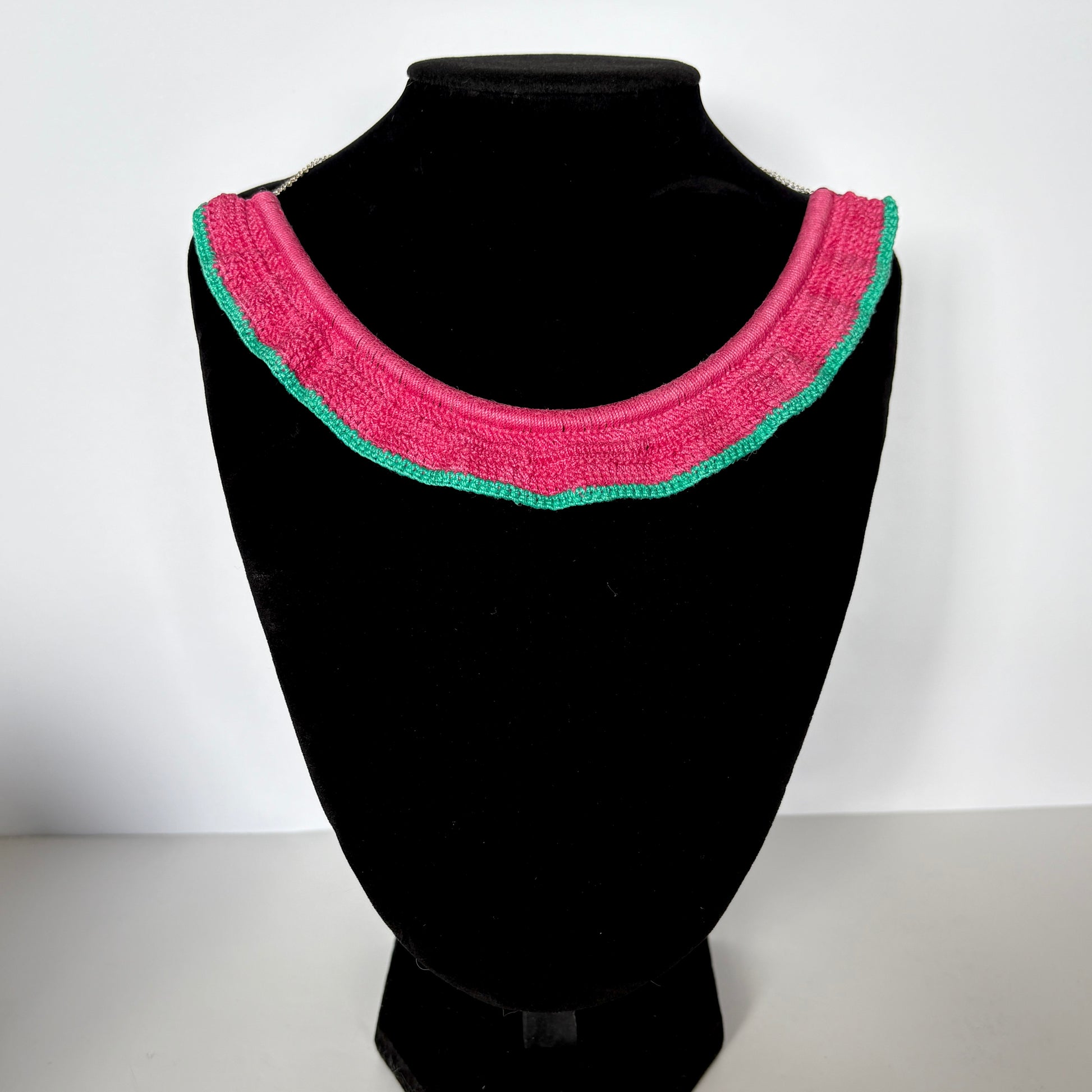Bright, bold, and full of flavour — the Raspberry Necklace channels the lush sweetness of summer’s ripest fruit. Hand-crocheted over a custom 3D-printed base, its scalloped green edge adds a crisp contrast to the juicy pink foundation. This piece is a celebration of joyful design and tactile craft, blending architectural structure with playful colour for a standout everyday statement.