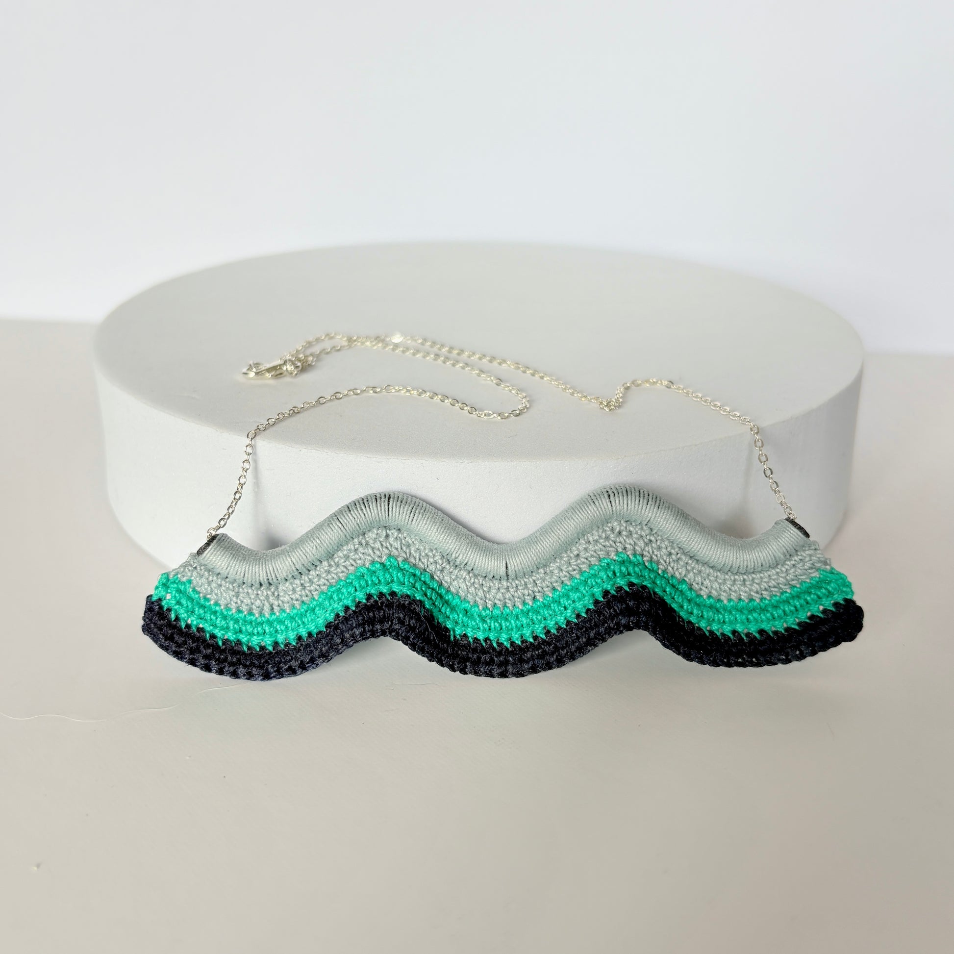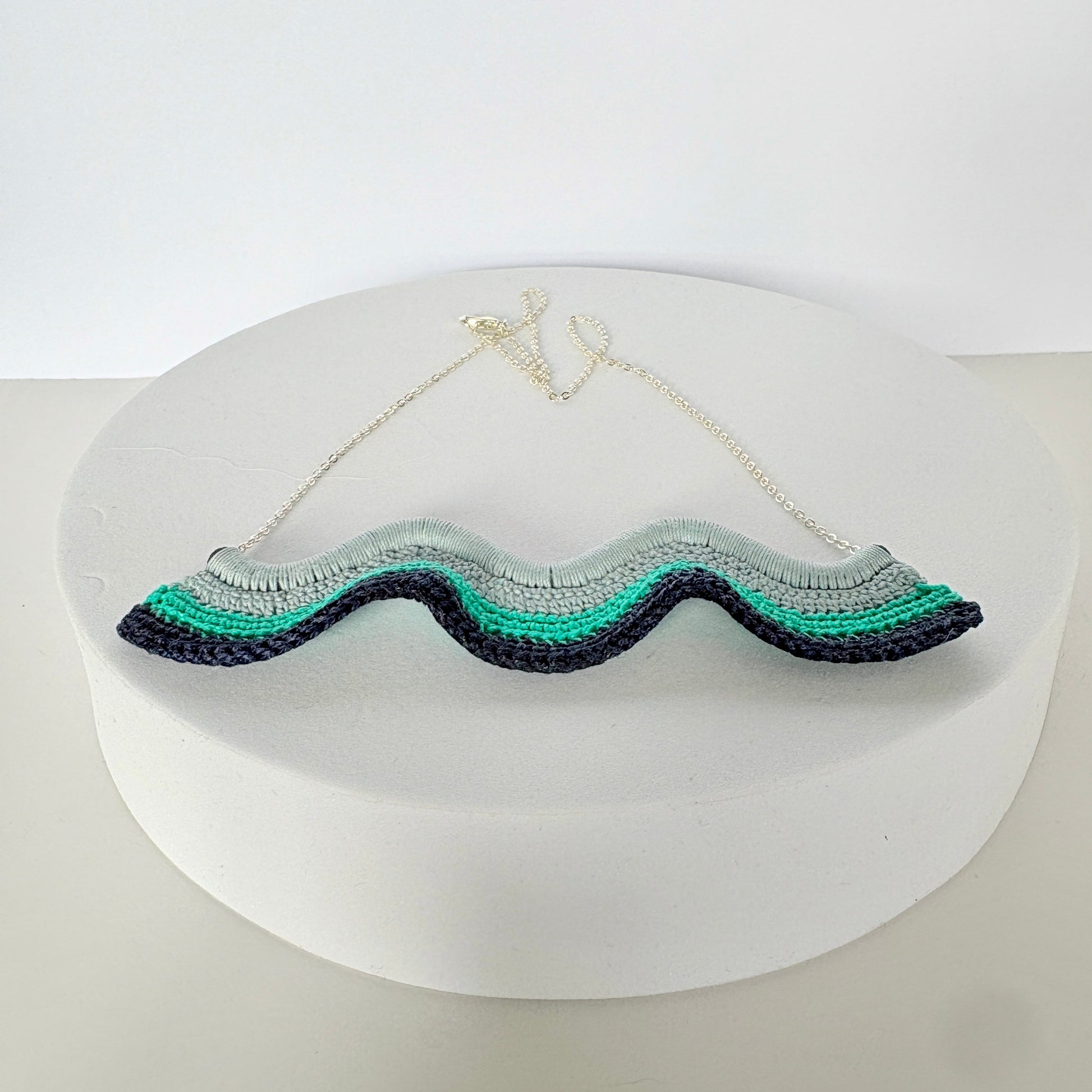 Inspired by the rhythm of the sea and the contours of coastlines, the Waves Necklace celebrates movement, balance, and structure. Crocheted by hand over a custom designed and 3D-printed base, this piece is where modern making meets textile tradition. The gradient of seafoam, mint, and deep navy threads evoke layers of tide and foam, while the sculptural wave form adds depth and dimension. Lightweight yet bold, this necklace is a wearable ode to the flow of nature and the beauty of handcrafted design